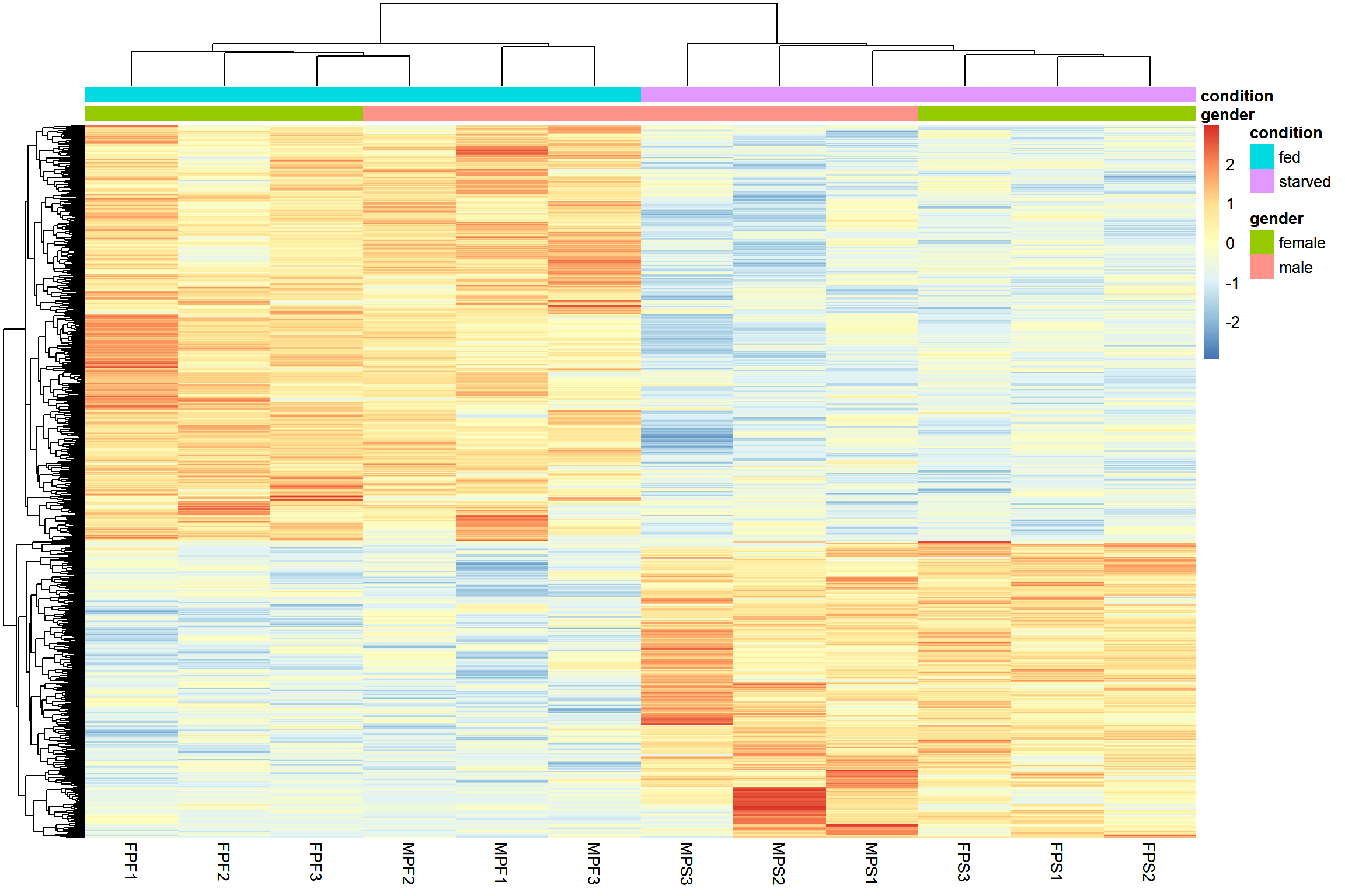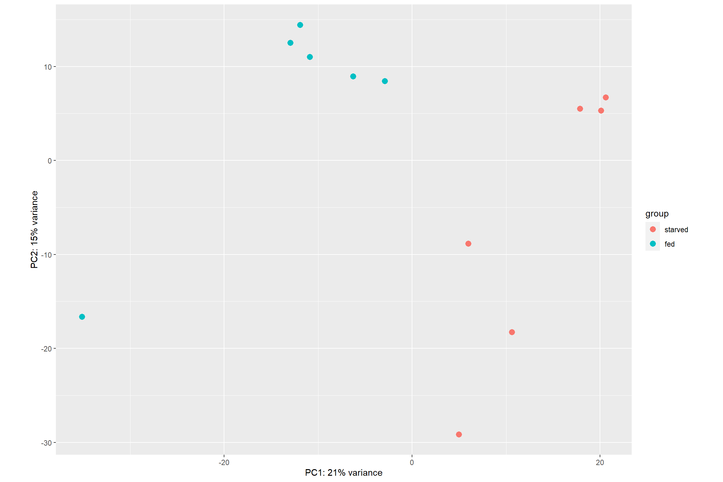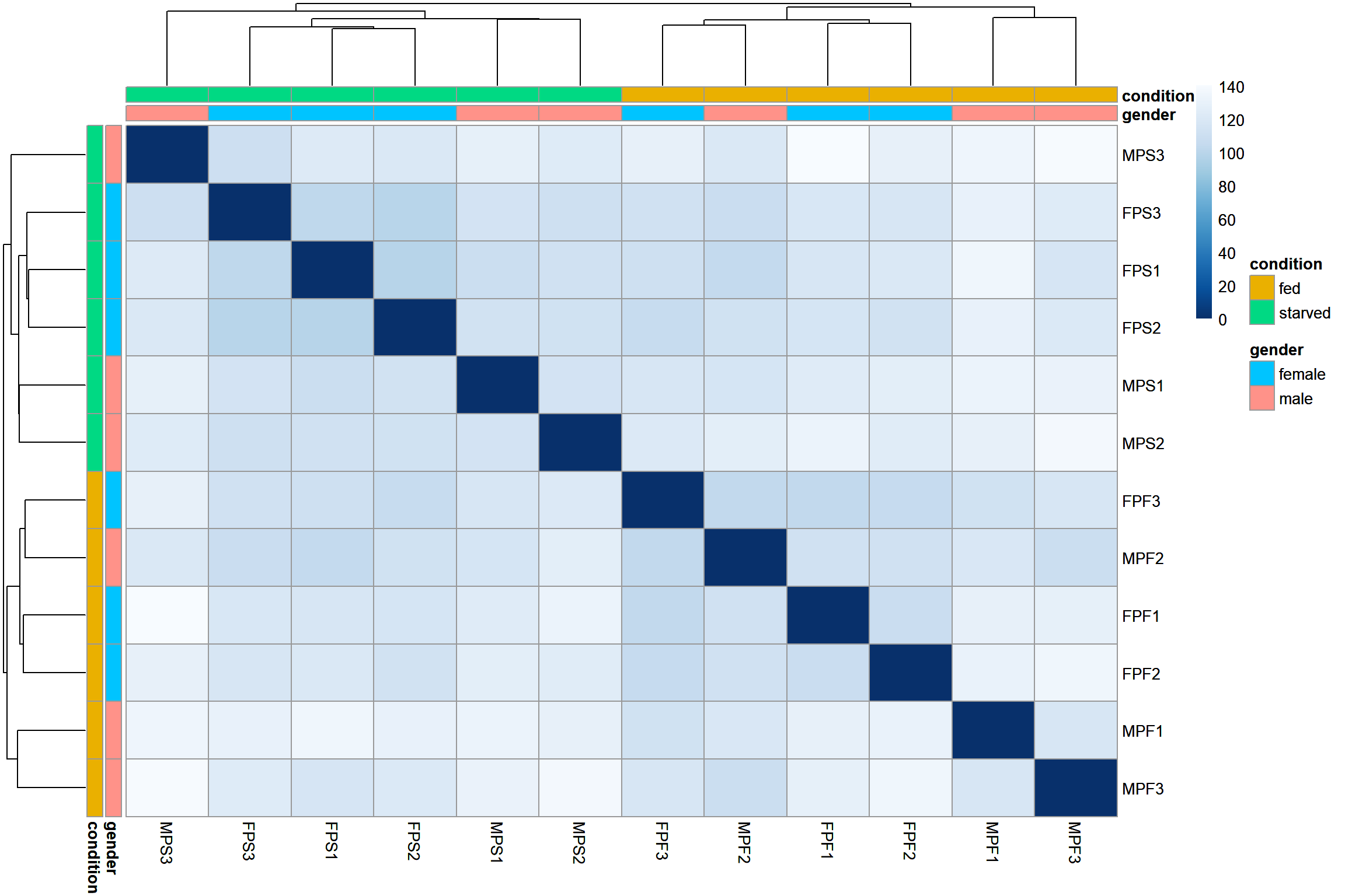 dds$condition <- relevel(dds$condition, ref = 'starved')Before performing DE analysis, it is always important to explore and visualize the data to see if there is evidence of differences among the samples, if the replicates track each other, identify potential replicates, or even determine if samples were swapped in the laboratory (more common than you will imagine).