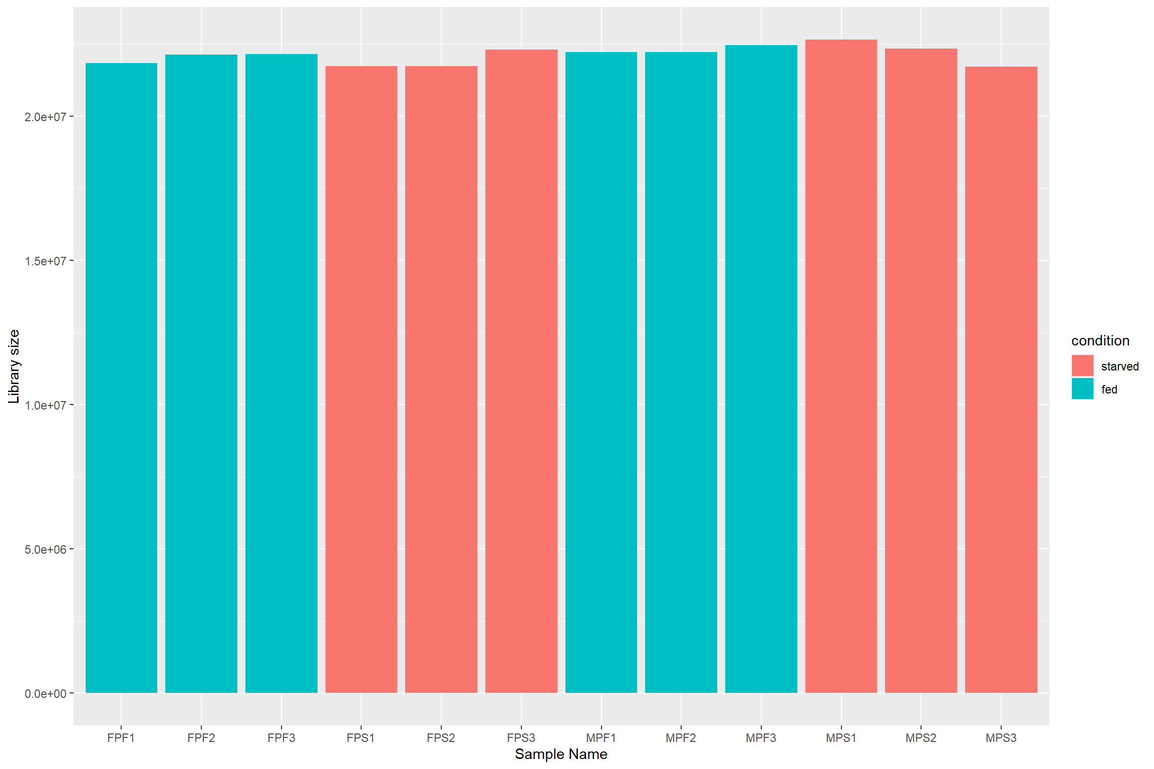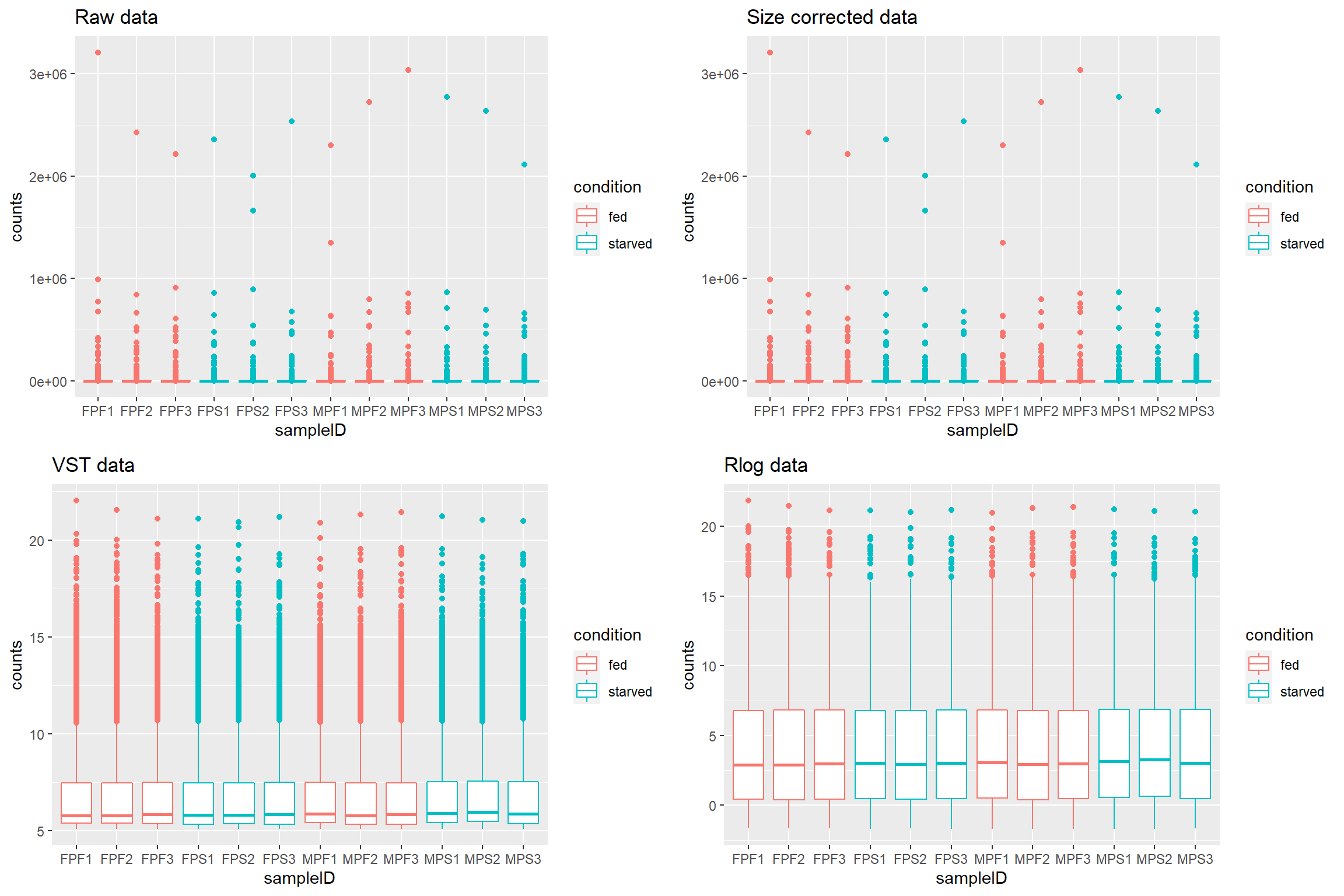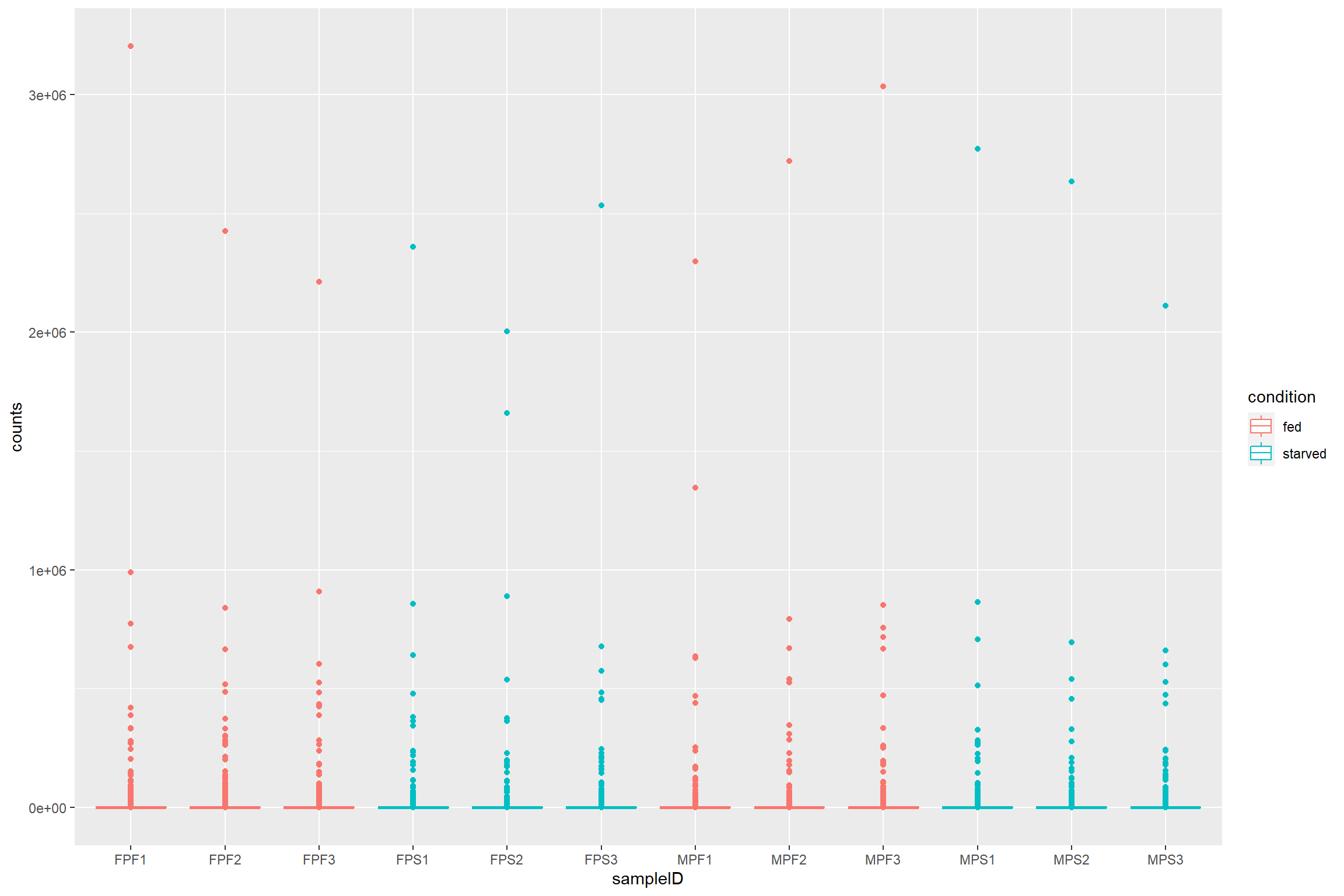 dds$condition <- relevel(dds$condition, ref = 'starved')Before performing DE analysis, it is always important to explore and visualize the data to see if there is evidence of differences among the samples, if the replicates track each other, identify potential replicates, or even determine if samples were swapped in the laboratory (more common than you will imagine).